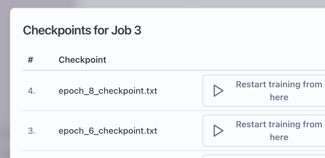 Systematically manage your artifacts, data, models, and checkpoints, tracking exactly which code, dataset version, and config produced a specific checkpoint. Resume training instantly after a failure without wasting compute. All data is synchronized across nodes and between trains, even when using ephemeral compute, ensuring your assets are always accessible.
