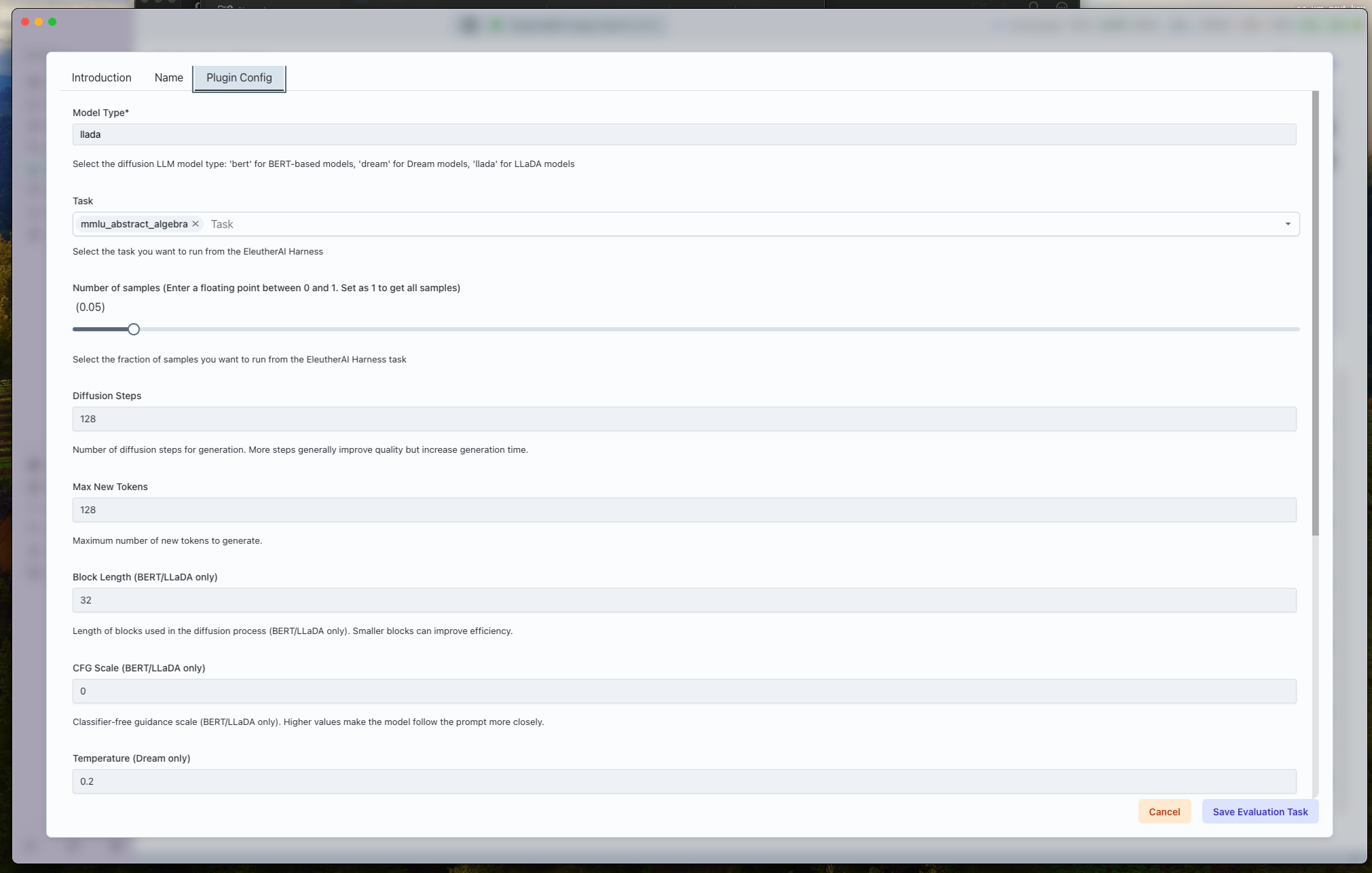 The evaluator exposes dllm-specific decoding controls (diffusion steps, CFG scale, temperature, etc.) so you can match your training configurations for fair comparisons.