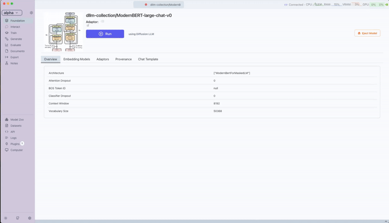 The Diffusion LLM Server plugin lets you interact with text diffusion models in real-time. Generate text, chat with models, and experiment with different diffusion parametersโall through Transformer Lab's intuitive interface.