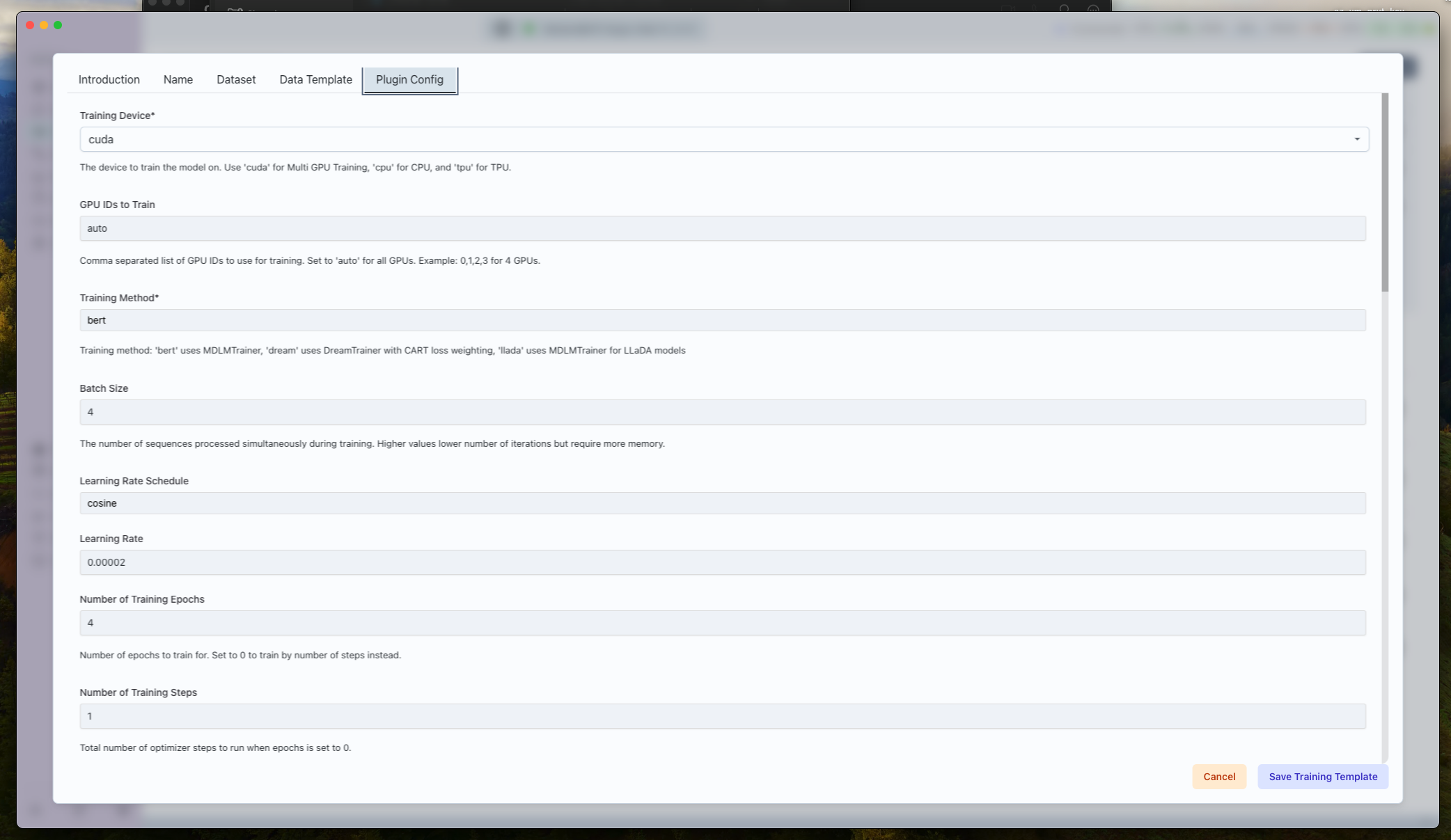 Train your own text diffusion models using our comprehensive training plugin. The Diffusion LLM Trainer supports: