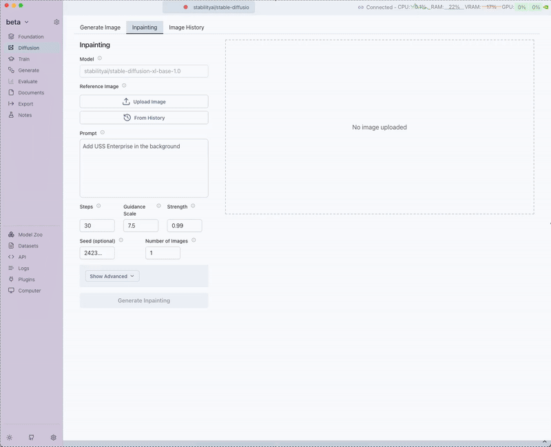 - Downloaded diffusion model with inpainting support (see Downloading Models)