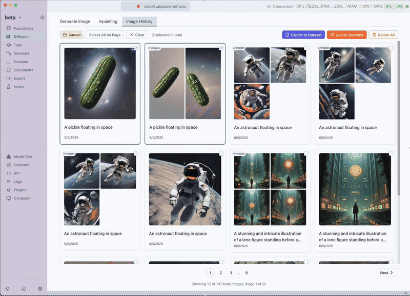One of the most powerful features of Image History is the ability to convert your generated images into training datasets for future diffusion model training.