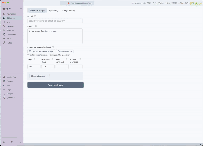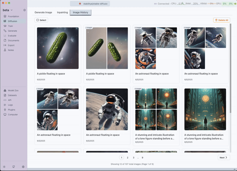 Transformer Lab automatically saves all your generated images from Text-to-Image, Image-to-Image, and Inpainting workflows, creating a comprehensive history that you can manage, organize, and even convert into datasets for future training.