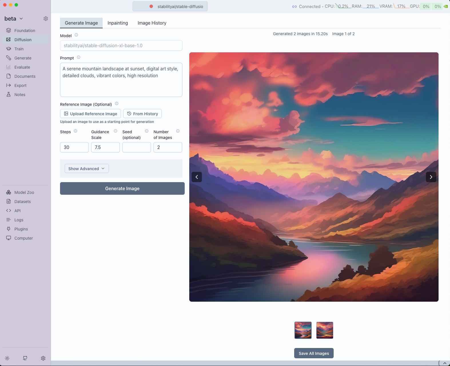 Generate high-quality images from text descriptions using diffusion models in Transformer Lab.