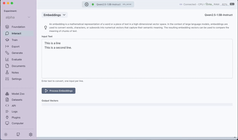 The Embeddings feature allows you to obtain the embedding vectors for any input text. Simply enter your text and the interface will process it to return the corresponding embedding vectors. These vectors represent the semantic meaning of your text in a high-dimensional space, which can be useful for various downstream tasks like similarity search and clustering.