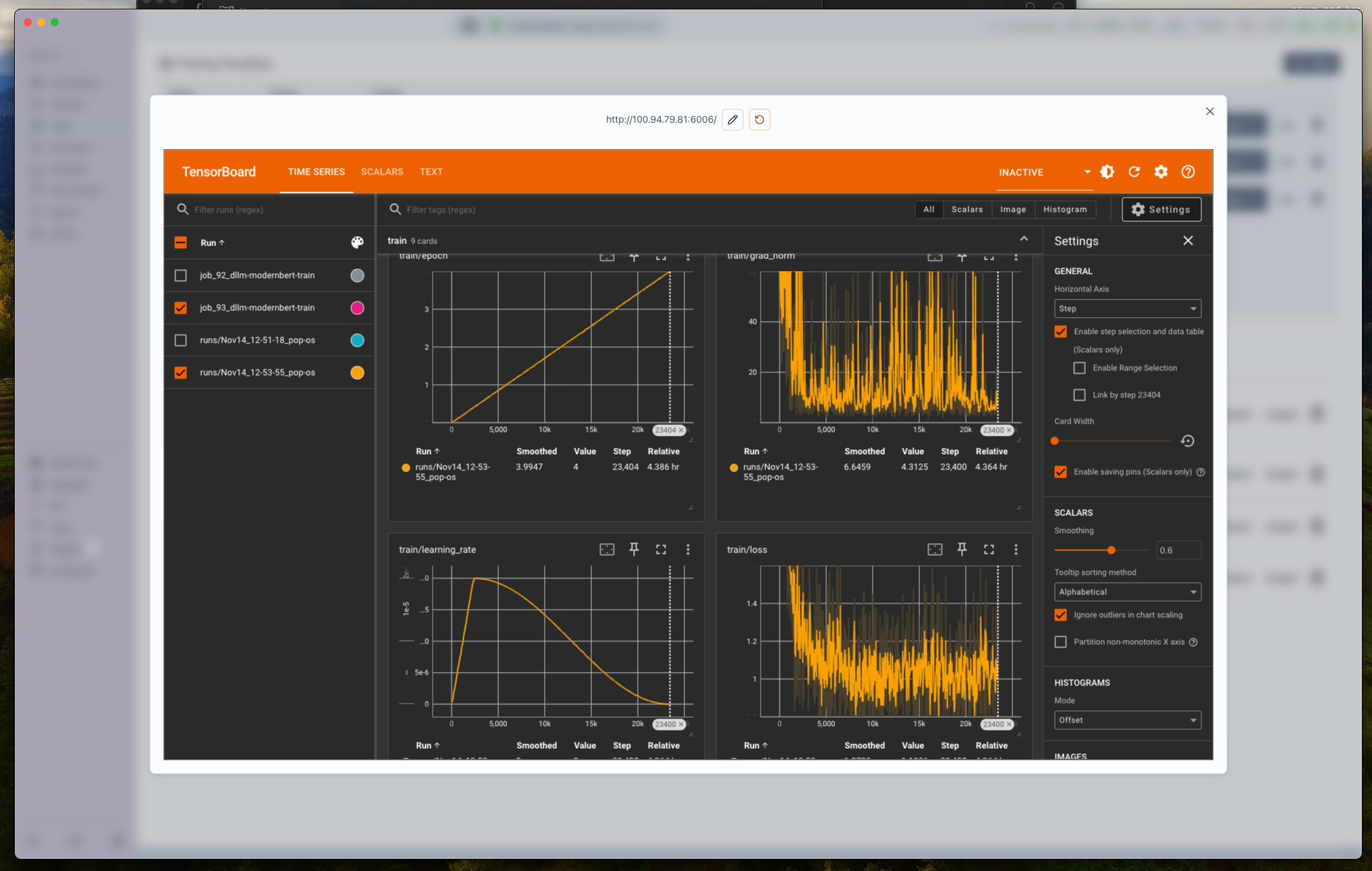 - TensorBoard: Open the sidebar log link to inspect loss and learning-rate curves directly in Transformer Lab.